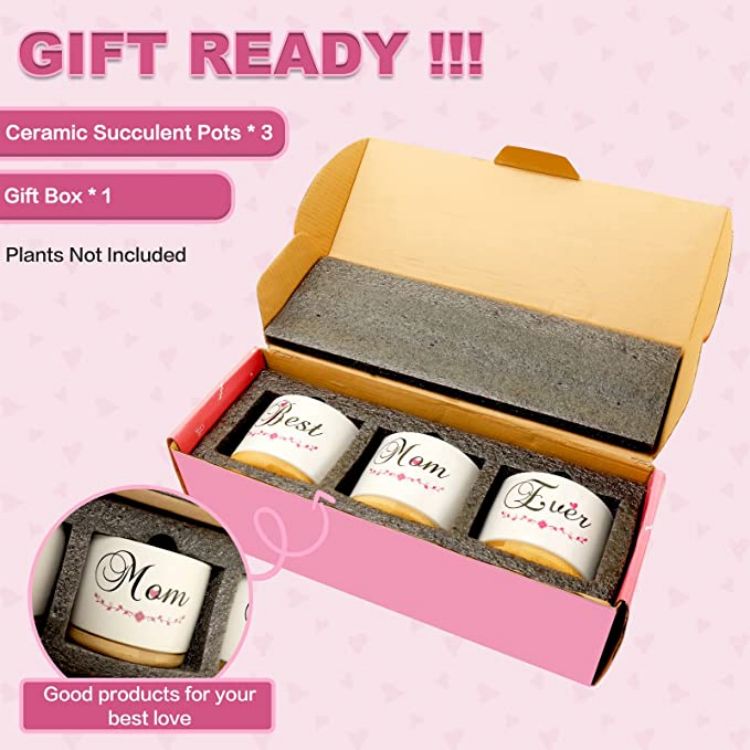 ? DIY FAVORITE PLANTS – Succulents are not included in mom gifts, so the gift receiver can put her favorite plants in pots. Each of the 3 ceramic pots has a small drainage hole and includes 3 small bamboo saucers to catch water from the plants.